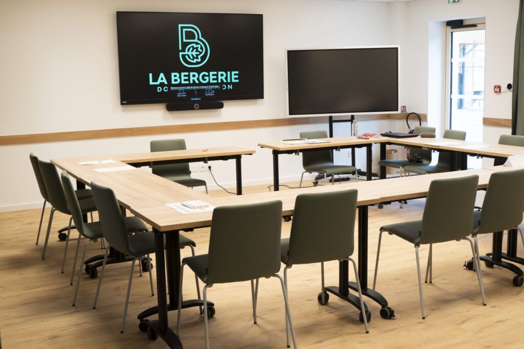 Les salles de réunion de la Bergerie sont entièrement équipées avec écrans, systèmes audio et configurations modulables, idéales pour vos séminaires et réunions professionnelles.